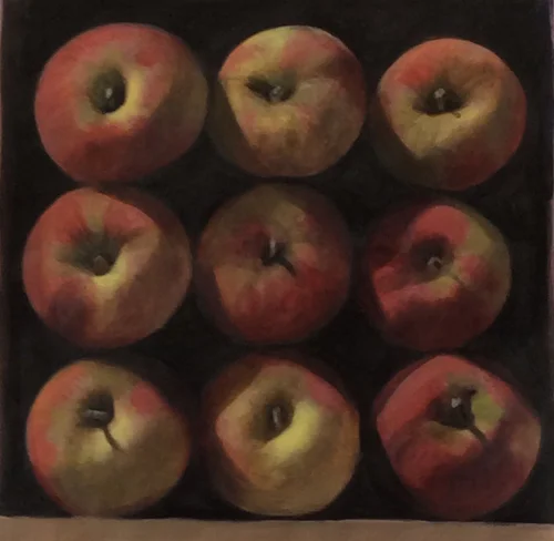 These paintings of pieces of fruit, in acrylic, gouache and watercolour on paper, are painted from observation in direct sunlight, which enhances and transforms surface and detail. The simple minimal compositions highlight the variety and individuality of each piece of fruit, and nuances of surface, shape, volume, light and colour count considerably.