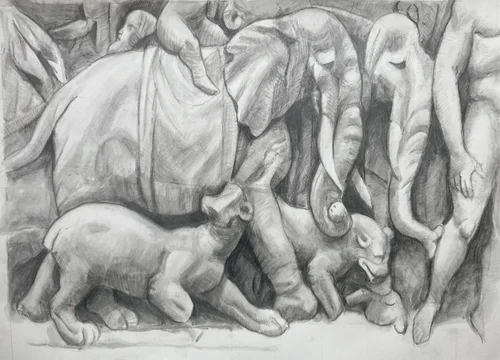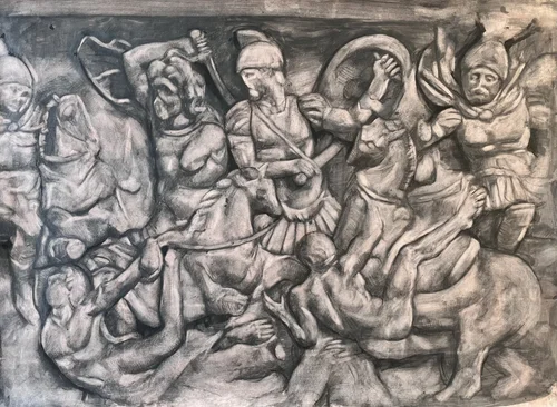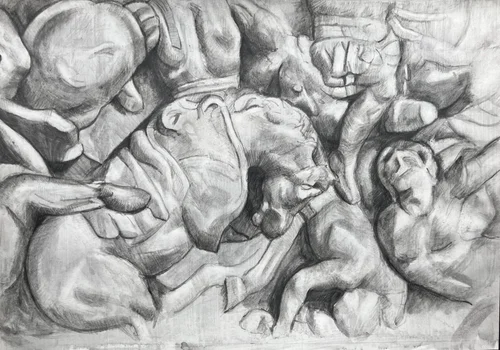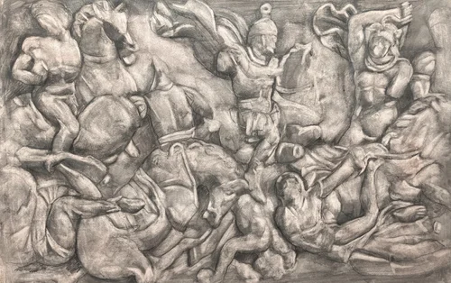 These drawings are from fragments of relief carvings which I have seen and admired on Roman Sarcophagi in museums in Italy, France, Germany and Turkey, and the best of which are still impressive-although often damaged-after up to 2,000 years. The extended horizontal compositions are powerfully orchestrated sequences of compression, rhythm, detail, energy and animation. The usually violent subjects are presented in silent, graceful, almost balletic arrangements. They often include incomplete components (such as human and horses’ heads, or fragments of riders astride fragments of horses), transformed into new and more mysterious entities.