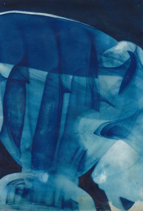 The cyanotype process has been an intriguing, indeed obsessive new area which I started to explore while confined indoors during COVID. It captures and makes permanent the eccentricity and unpredictability of patterns of light flowing through glass, clear plastic and other commonplace things, which are transformed into somewhat magical, spectral images. They seem to convey the quiet mystery to be found in everyday things. Doing these is very structured, especially around the length of exposure, the time of day, the geography of the room and the way sunlight enters and moves across it. Transparent objects appear to “flow” into a multitude of new shapes when transformed by the cyanotype process, within the parameters of time, focus and luminosity, and the wonderful encounter between photons of sunlight and the surface of sensitized paper.